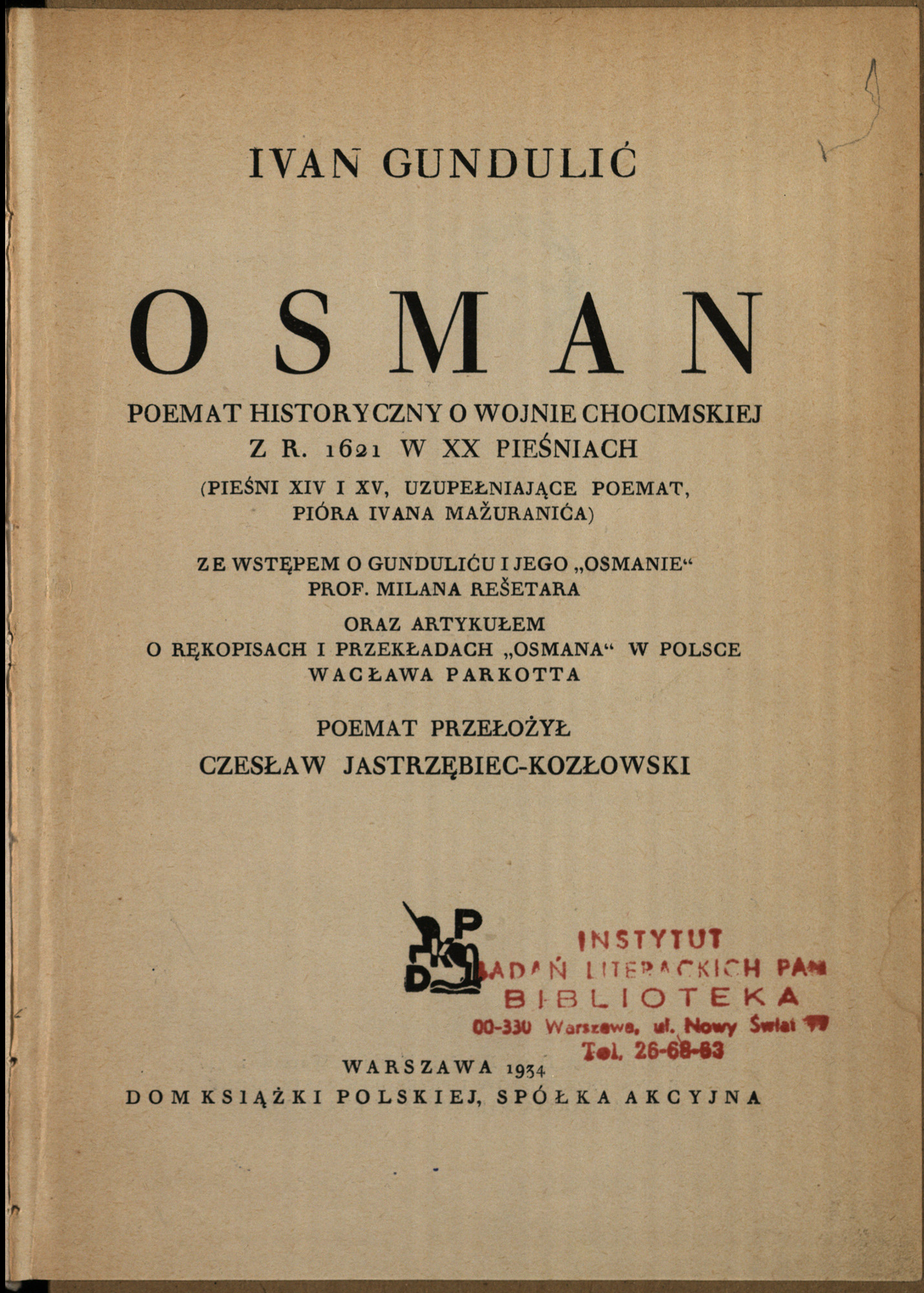 Karta tytułowa Osmana Ivana Gundulicia w tłumaczeniu Czesława Jastrzębca-Kozłowskiego Źródło: Biblioteka IBL PAN