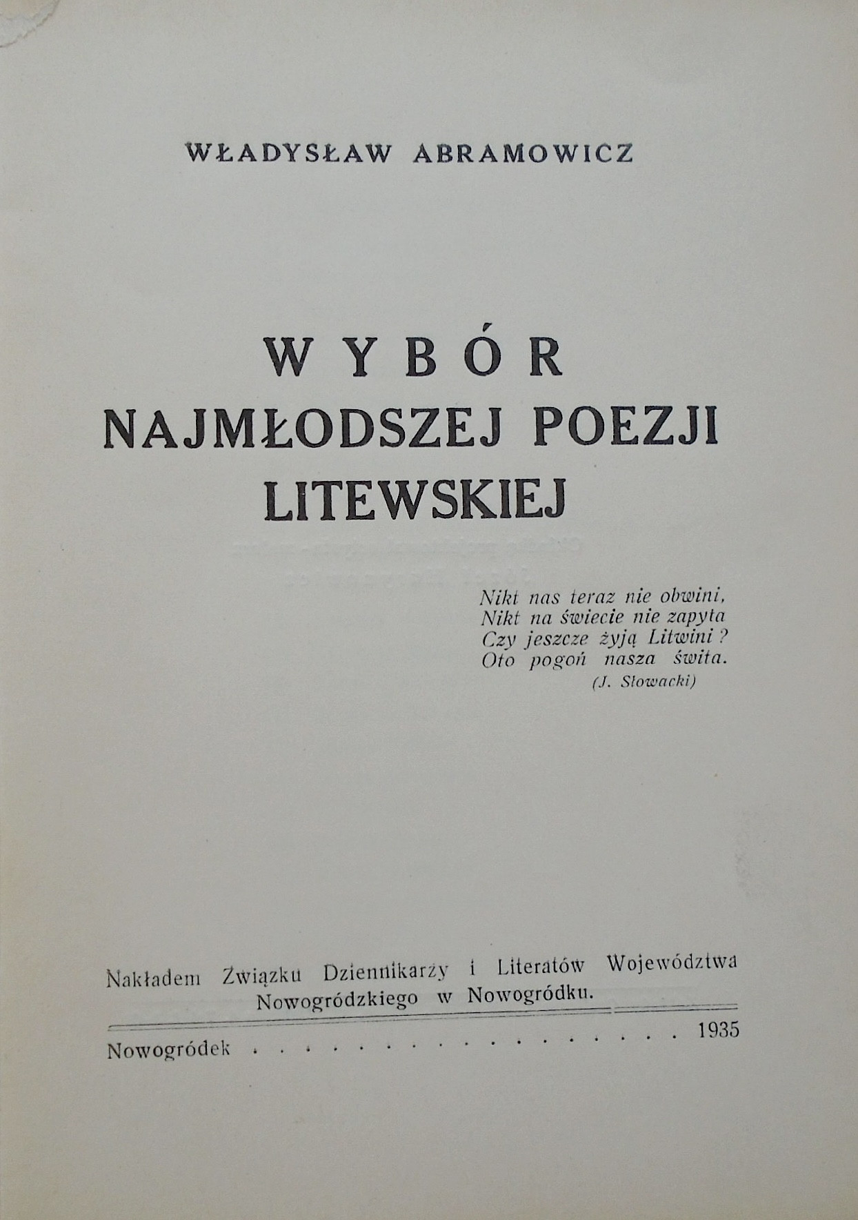 Wybór najmłodszej poezji litewskiej. [Antologia]. Przełożył W. Abramowicz. Słowo wstępne: Władysław Abramowicz. Nowogródek: Związek Dziennikarzy i Literatów Województwa Nowogródzkiego 1935, 118 s.