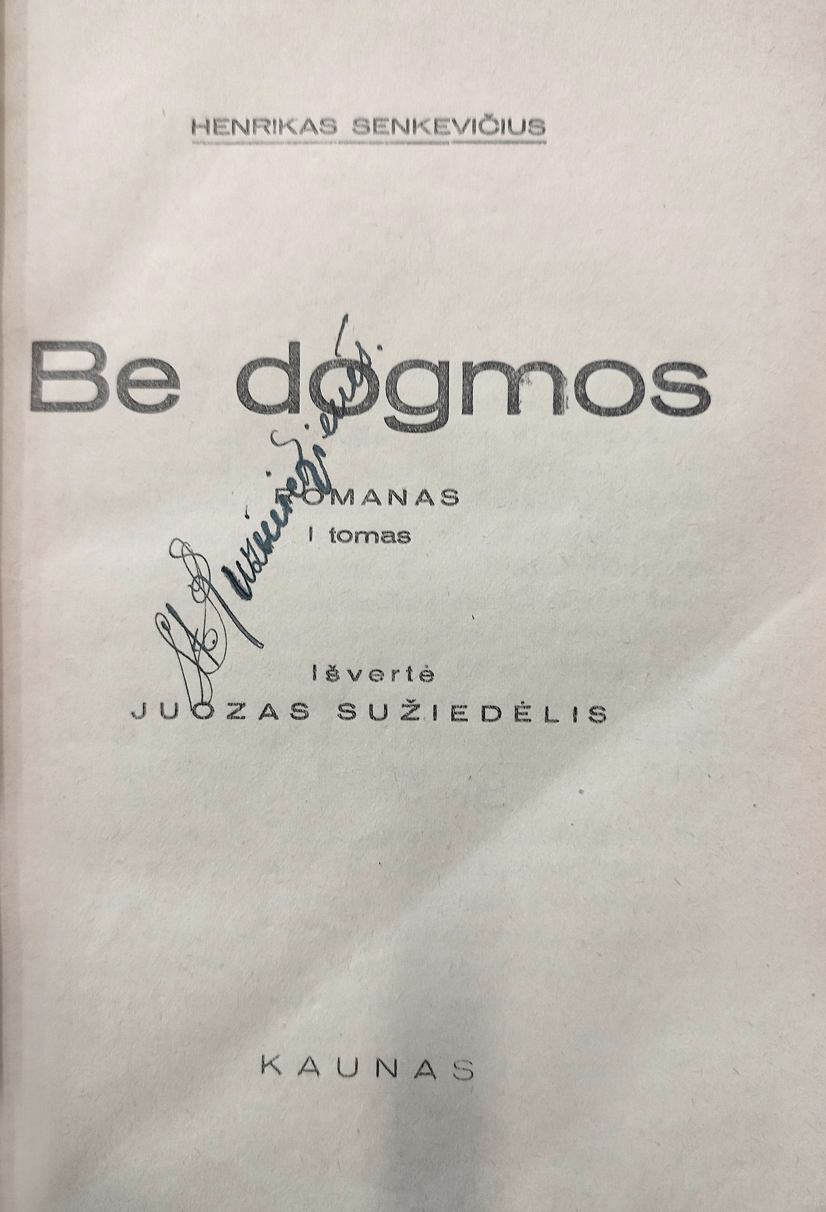2. H. Senkevičius: Be dogmos. Romanas. Išvertė J. Sužiedelis. T. 1-2. Kaunas-Marijampolė: Dirvos b-vė 1936, 206 + 212 s.