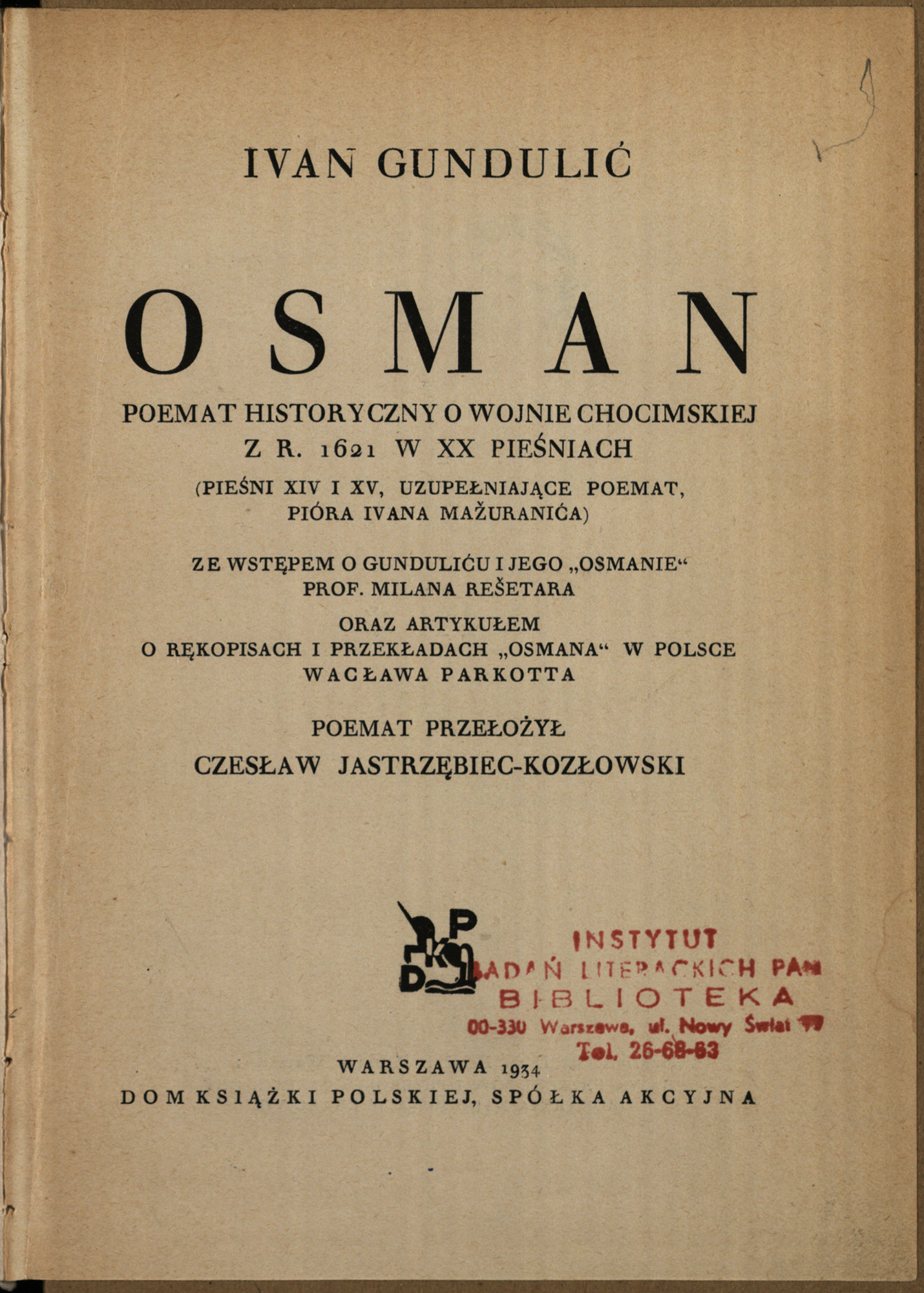16. I. Gundulić: Osman. Poemat historyczny o wojnie chocimskiej z r. 1621 w 20 pieśniach (pieśni 14 i 15, uzupełniające poemat, pióra I. Mazuranica). Ze wstępem o Gunduliću i jego „Osmanie” M. Resetara oraz artykuł o rękopisach i przekładzie „Osmana” w Polsce W. Perkotta. Poemat przełożył Cz. Jastrzębiec-Kozłowski. Warszawa: Dom Książki Polskiej 1934, 473 s. Biblioteka Jugosławiańska, t. 4.