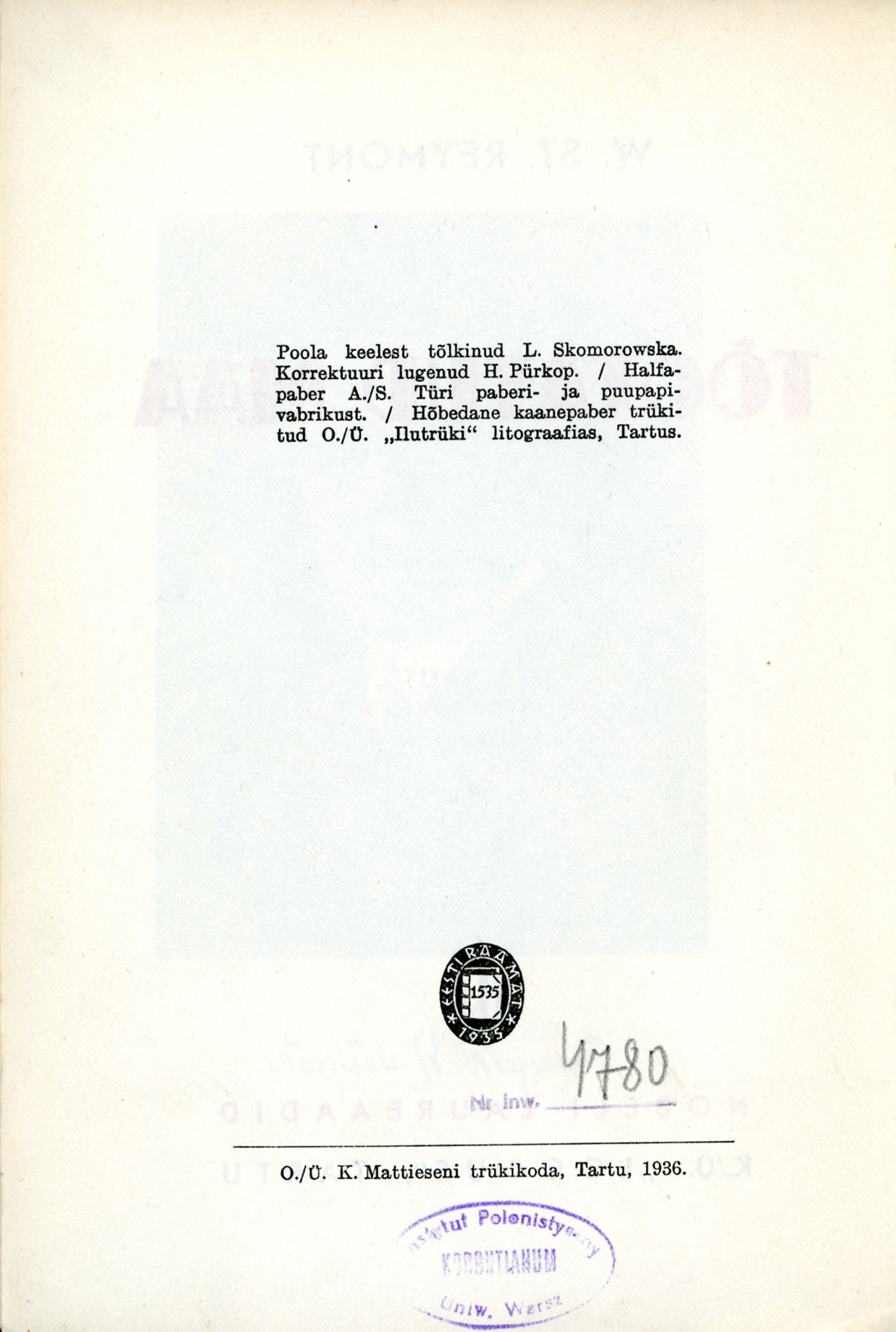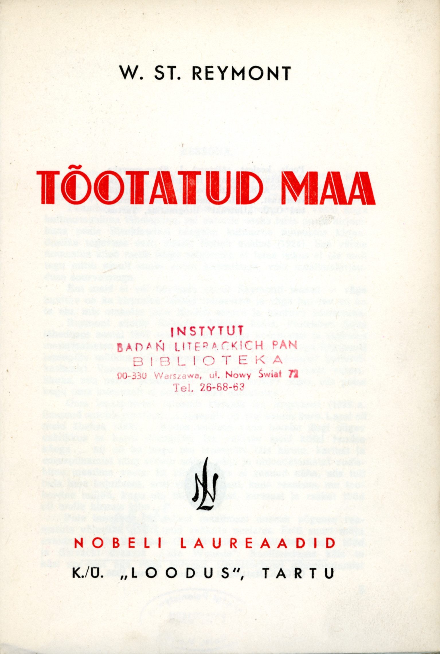 5. W. Reymont: Tõotatud maa. Rromaan. Poola keelest tõlkinud L. Skomorowska. Eessõna: J.Kaplinski. Kaaneümbris: E. Kollom. Tartu: Loodus; K. Mattiesen 1936, 631 s.